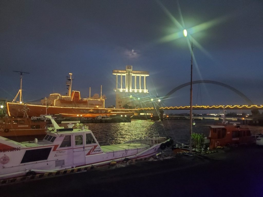 奥にある名古屋港ポートビルと南極観測船ふじがライトアップされ、海にかかった橋も輝いております。