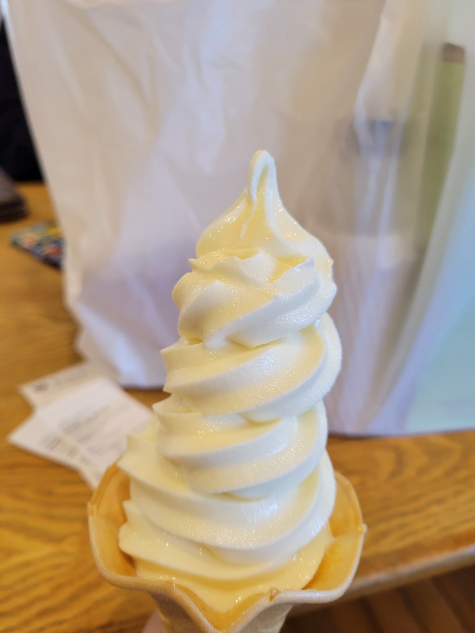暖かいレストランで、景色を眺めつつ食べる牧場のソフトクリームは最高ですなぁ……。