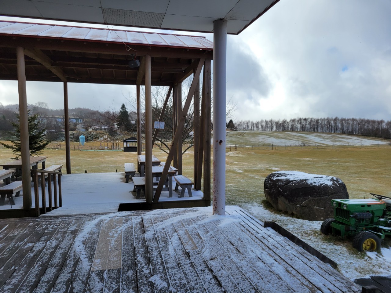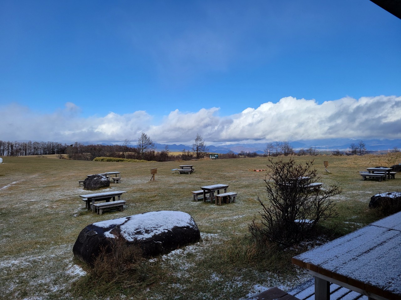 牧場の草原に吹き抜ける青空、ほんのり雪化粧なのがまた良いですね! この雪に苦しめられているんですが!