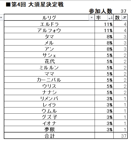 トナメは2ルルン×2、グズ子、カーニバル、ナナシ、タマ、アン、イオナ(ユキ)だったそうです。